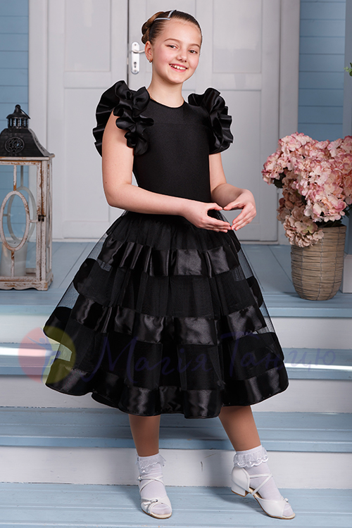 Новинка! Детское платье для бальных танцев черного цвета подчеркнет фигуру девочки и станет наиболее практичным платьем для конкурсов, ведь темный цвет не такой маркий, как светлый, что не может не порадовать мам.
